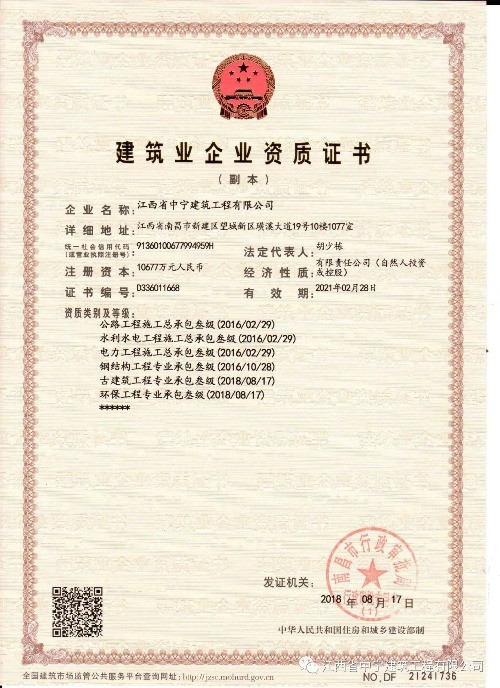江西省中寧建筑工程有限公司位于江西省南昌市紅谷灘新區(qū)世貿(mào)路898號博能中心A座12樓,是一家具有房屋建筑工程施工總承包一級、建筑裝修裝飾工程專業(yè)承包一級、地基與基礎(chǔ)工程專業(yè)承包一級、城市及道路照明工程專業(yè)承包一級、電子與智能化工程專業(yè)承包一級、市政公用工程施工總承包二級、城市園林綠化二級、水利水電工程專業(yè)承包三級、公路工程施工總承包三級、電力工程施工總承包三級、鋼結(jié)構(gòu)工程專業(yè)承包三級、古建筑工程專業(yè)承包三級,環(huán)保工程專業(yè)承包三級、地質(zhì)災(zāi)害治理工程丙級,并獲得海外承包工程資質(zhì)證書、重合同守信用AAA級企業(yè)。