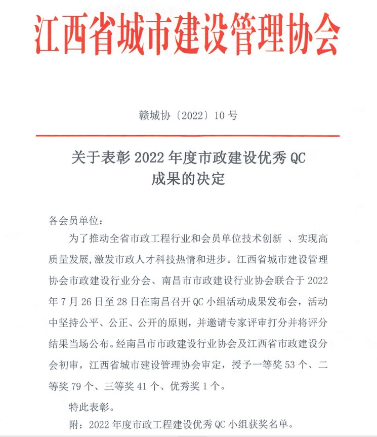 2022年7月26日至28日,江西省城市建設管理協會市政建設行業(yè)分會、南昌市市政建設行業(yè)協會在南昌召開QC小組活動成果發(fā)布會,江西省中寧建筑工程有限公司榮獲一等獎1個(排序9),二等獎1個(排序64)。
